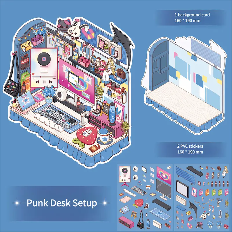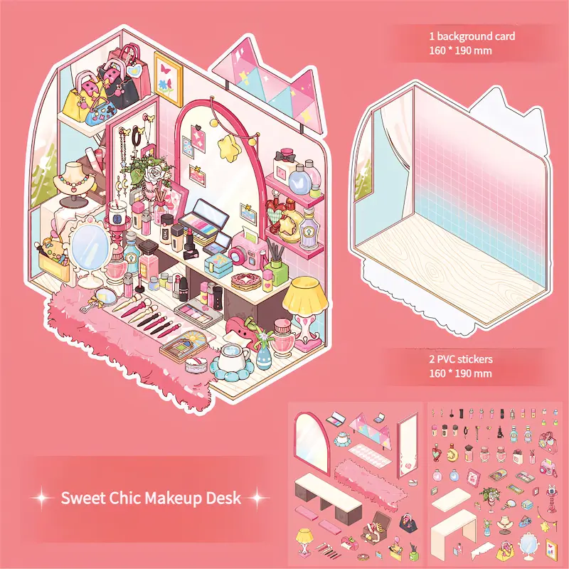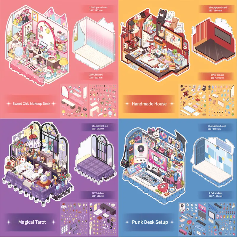 Step into a Creative World of Style, Magic, and Charm with Our 3D Sticker Book – with four unique themes: Magical Tarot, Handmade House, Punk Desk Setup, and Sweet Chic Makeup Desk. Each miniature sticker scene invites you to explore your imagination and decorate in your own playful way.