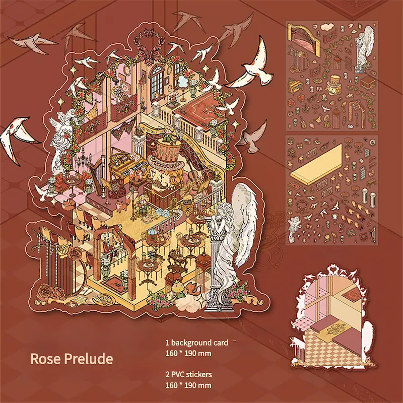 • Rose Prelude : Enter the romantic room of the Rose Prince, where delicate roses bloom in every corner. This lovely sticker scene is filled with vintage charm and soft hues, perfect for creating a 3D sticker room full of tenderness and elegance. A must-have for anyone who loves stickers of lovers and stickers in love.