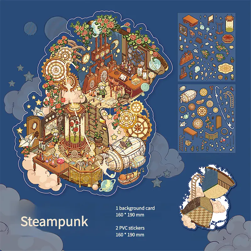 • Steampunk: Bold and brilliant, the Inventor Prince’s workshop combines the charm of fantasy with mechanical marvels. Gears, gadgets, and golden pipes bring this 3D sticker room to life, offering a miniature world of adventure perfect for scene stickers and sticker lovers alike.