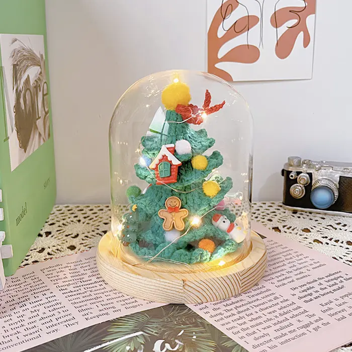 This enchanting crochet Christmas tree night light showcases a miniature handcrafted tree adorned with colorful ornaments, candy canes, and a cheerful gingerbread man, all delicately placed under a clear protective dome. The warm LED lights gently illuminate the tree, creating a festive and magical glow that brings the spirit of Christmas into any room. Paired with a bright red holiday gift bag featuring Santa and his reindeer, it makes for not just a decoration but also a ready-to-give Christmas present filled with joy and holiday cheer.