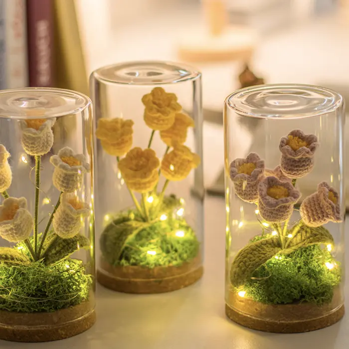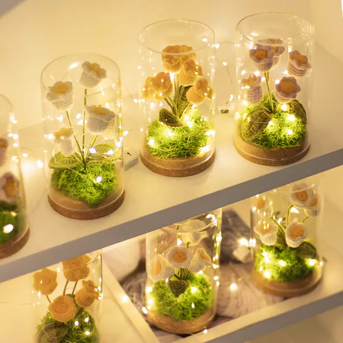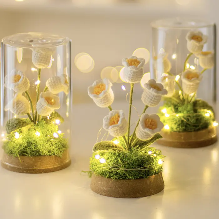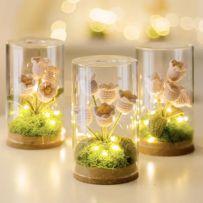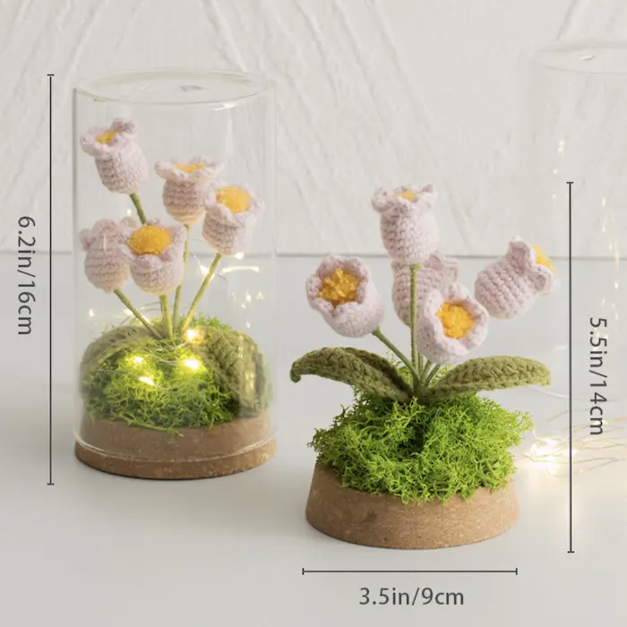 • Premium Quality & Lasting Craftsmanship: Made with soft, durable yarn and eco-friendly materials, this crochet lily of the valley night light is safe, odorless, and long-lasting. The protective glass dome shields the blossoms from dust while keeping their elegance intact for years.