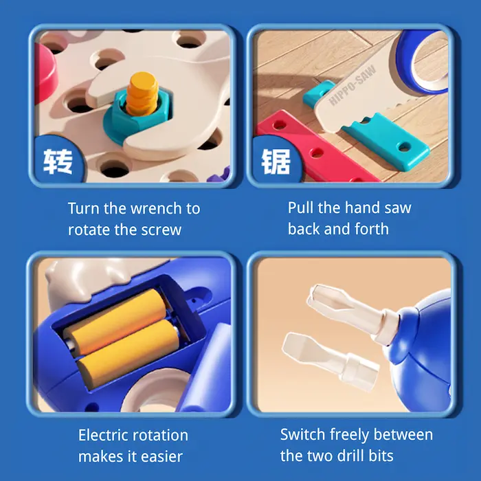 Realistic Electric Drill: The drill bits can be freely switched. The electric drill features a low-speed, slow-rotation design, making screw-driving easy and effortless while ensuring safety for little hands. Kids can enjoy a realistic tool experience with peace of mind.