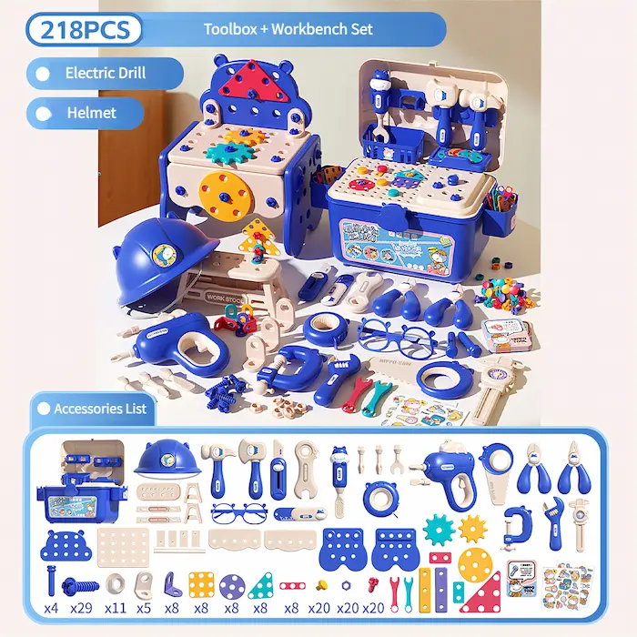 Complete 218-Piece Building Kit: Includes a toolbox, safety helmet, electric drill with interchangeable bits, screwdrivers, wrenches, hammers, pliers, colorful gears, bolts, and building plates. With such a wide variety of accessories, children have everything they need to dive into endless building projects, from simple structures to imaginative creations.